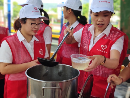 上午9點,志愿者們身著統一紅馬甲,在崗亭的安全島上設立服務臺,抬出食堂提前制作好的青草糊、綠豆湯等清涼飲品。你來分杯我來送,大家不亦樂乎開始了送清涼活動。
