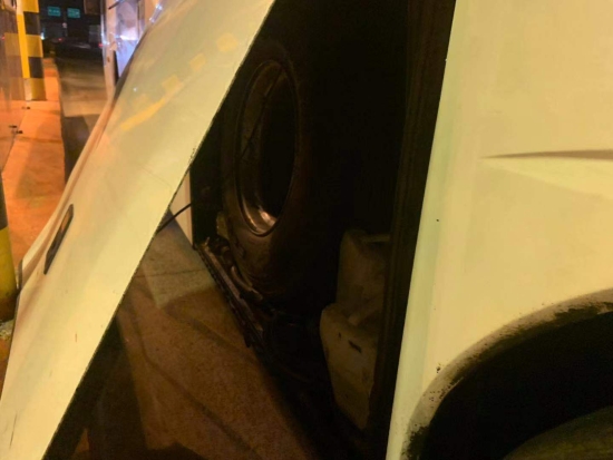 圖為被物品擠開的客車側(cè)門 此次事故由于客車車箱內(nèi)放置過多的物品,在車箱門邊上還硬塞了幾只大輪胎,最終導(dǎo)致輪胎將側(cè)門擠開而沒被司機(jī)發(fā)現(xiàn),在高速過ETC車道時箱門撞到了設(shè)備,司機(jī)對此也是后悔不已。 近期,收費(fèi)站發(fā)生過不少同類事件,有司機(jī)通過ETC車道時因車速過快未感應(yīng)到線圈,擋風(fēng)玻璃撞到欄桿;有集裝箱后門沒關(guān)撞到ETC設(shè)備。在此提醒過往司乘行車前務(wù)必要檢查好車輛安全情況,過ETC車道需要慢行。如果在高速上出現(xiàn)突發(fā)情況也不要慌張,及時向工作人員或者撥打求助電話請求幫助。 楊相暖