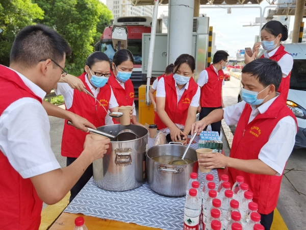 在溫嶺西收費所進出口處,志愿者們身穿紅馬甲,面帶微笑地向途經(jīng)的司乘們遞上一杯杯蓮子湯、紅棗綠豆湯,并溫馨提醒司乘注意疲勞駕駛。 近日,連續(xù)高溫,驕陽似火,為進一步延伸文明服務(wù),緩解司乘人員暑熱疲勞,臺州高速溫嶺西收費所組織志愿者積極開展“炎炎夏日送清涼”活動,為行駛在路上的廣大司乘送上一份夏日的清涼。