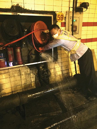 執(zhí)勤隊(duì)員們有序分工,紛紛帶上工具,開(kāi)始檢修消防設(shè)備、清洗隧道內(nèi)攝像頭、維修陳舊的機(jī)電設(shè)備、拆換燈具等等,現(xiàn)場(chǎng)一派忙碌的景象。四公里長(zhǎng)的隧道內(nèi)有82個(gè)消防箱,每隔50米就有一個(gè),而里面空氣質(zhì)量很差,比霧霾嚴(yán)重?cái)?shù)百倍,僅一只口罩根本凈化不了廢氣,但由于時(shí)間緊,任務(wù)重,隊(duì)員們顧不上惡劣的環(huán)境,努力和時(shí)間賽跑,爭(zhēng)取高效完成任務(wù)。