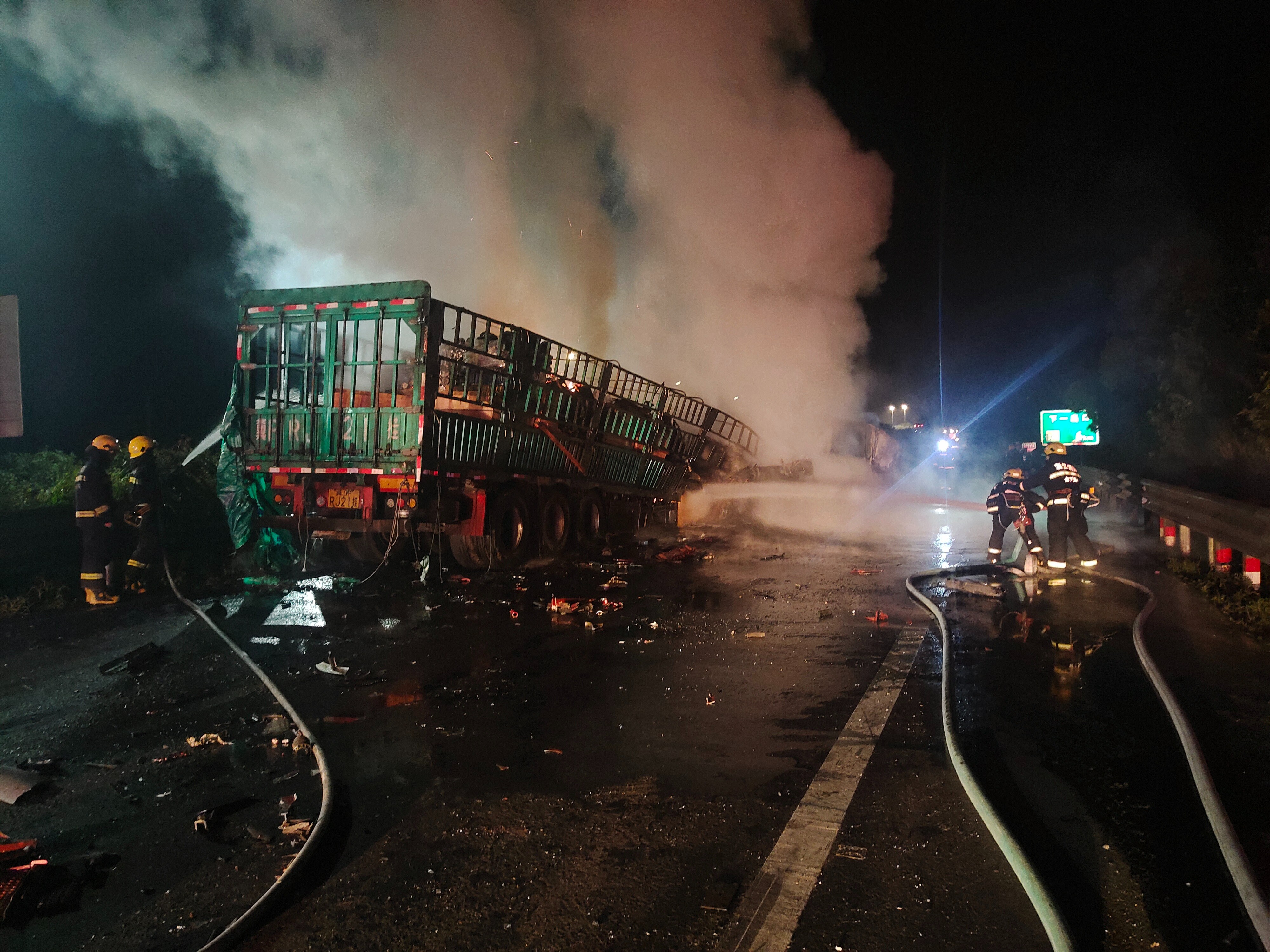 4月21日凌晨2點(diǎn),G15沈海高速甬臺溫段寧波方向距離黃土嶺隧道不到2公里的地方,有一輛半掛車與前車發(fā)生追尾事故,隨后起火燃燒。