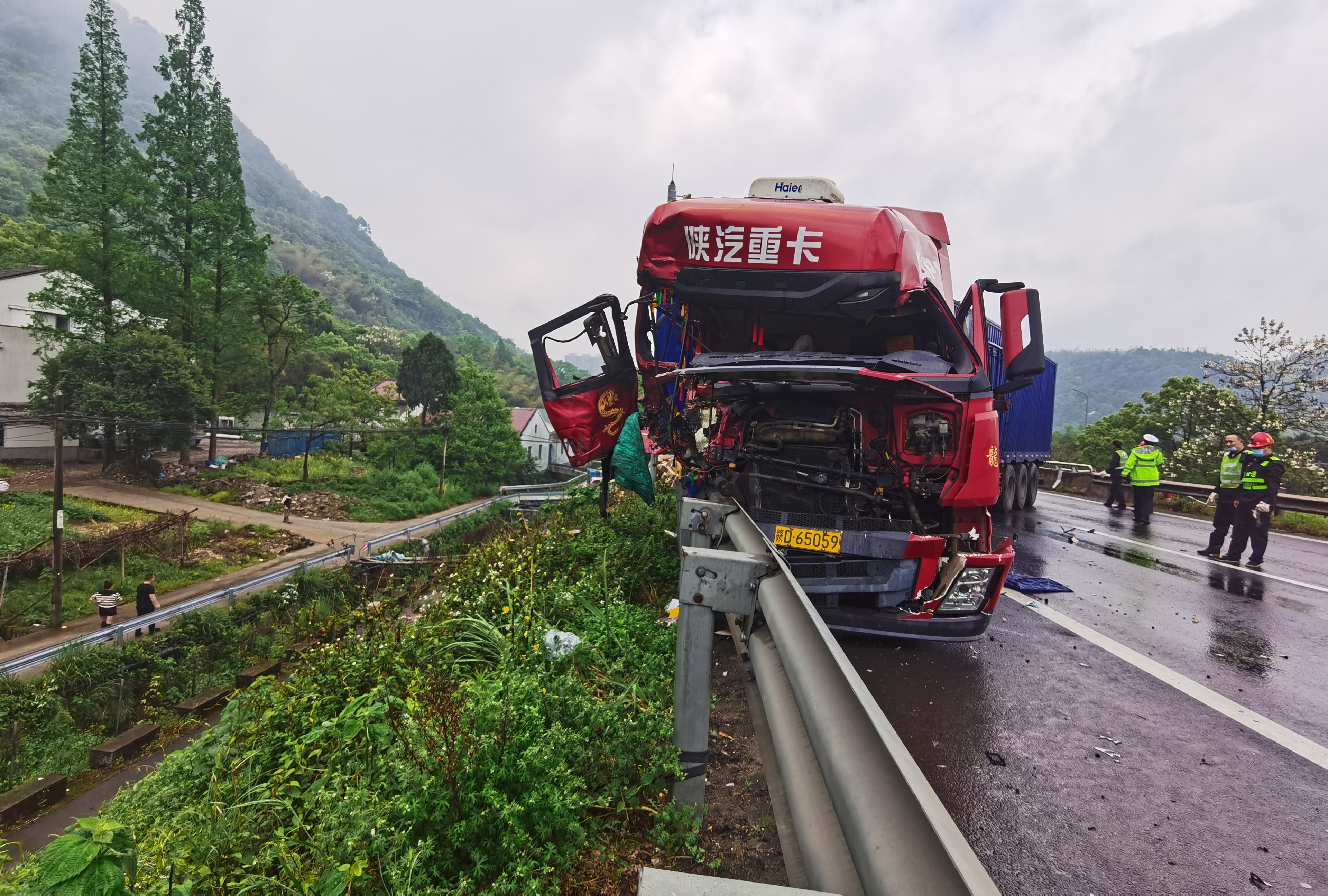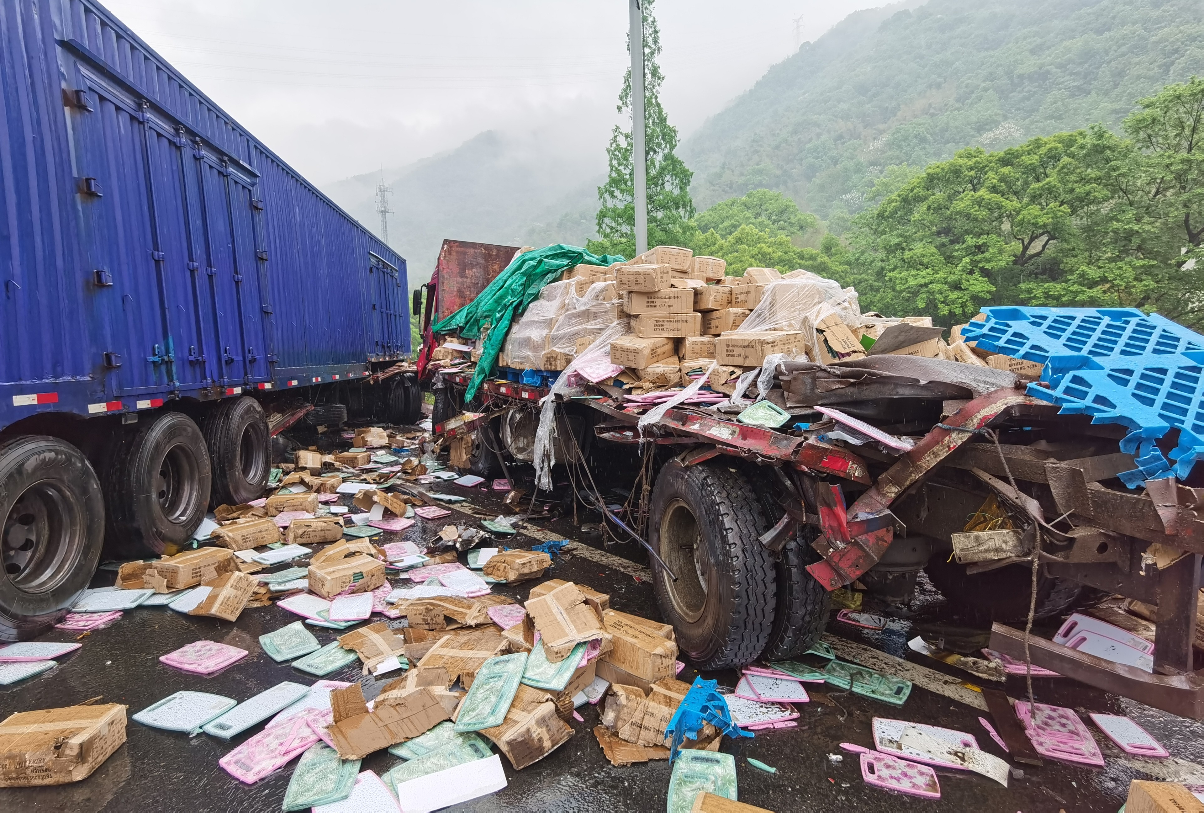 寧向洞口200米處,有一輛14米長的箱式大貨車避讓不及撞上了一輛平板小貨車,隨即又撞到隔離護欄,整個車頭瞬間被撞得七零八碎嚴重變形,車尾橫向路面且僅留小車能駕駛的空間。被追尾平板貨車所載貨品散落一地,高速路上護欄外一片狼藉,所幸無人員傷亡,大貨車司機膝蓋輕微傷。