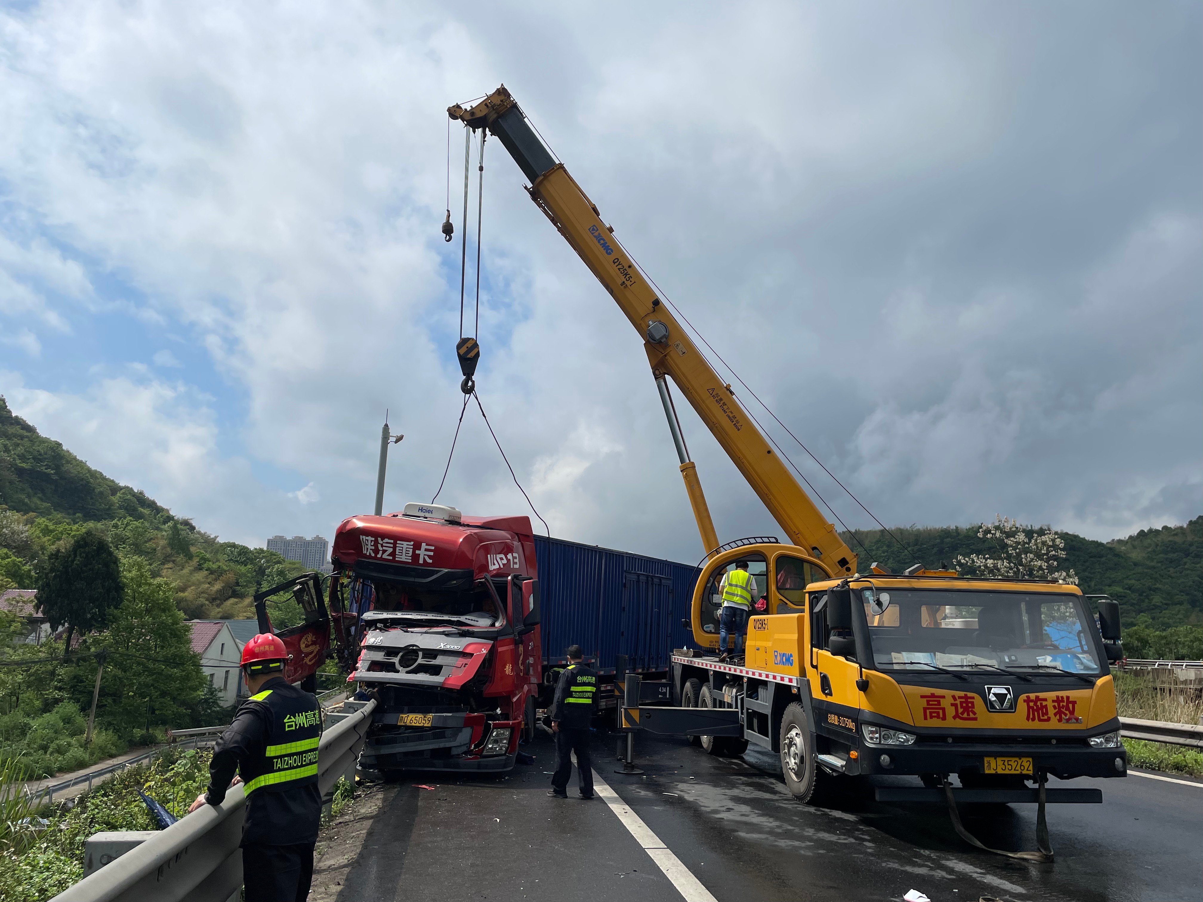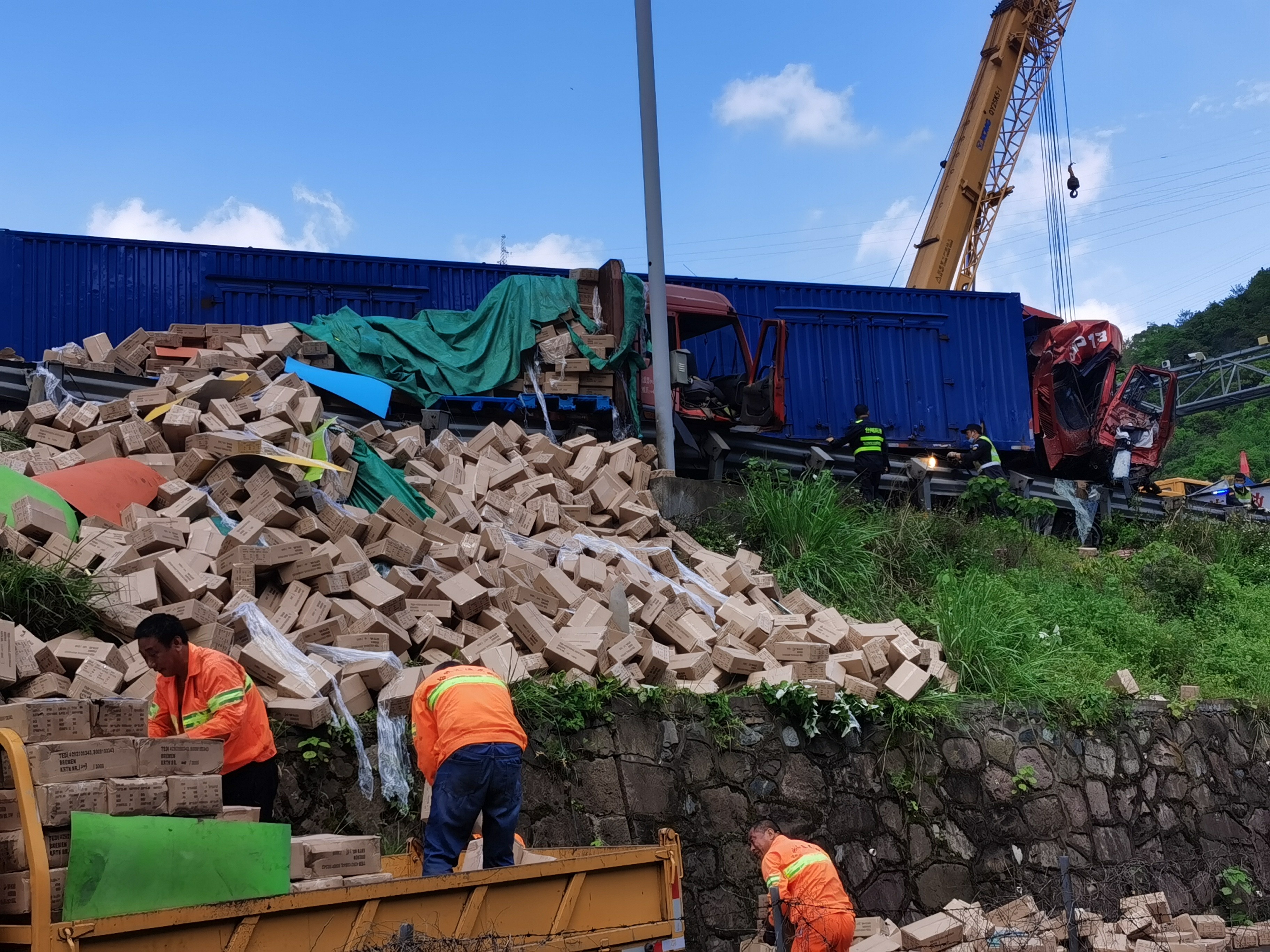 隨后,拖車救護車吊車相繼到達,所有人員立即有序分工,因大貨車車頭卡在護欄,需要切割,拖車難度較大需要吊車將其拖出,現場救援緊急開展隧道所工作人員協(xié)助駁貨車清理貨物和散落車架,保證高速路面通暢。