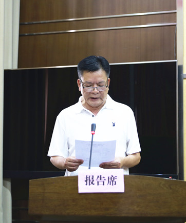 圖為公司副總經(jīng)理陳保衛(wèi)宣讀《關(guān)于轉(zhuǎn)讓臺州高速泰和房產(chǎn)公司股權(quán)的議案》