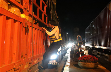 夜間綠農(nóng)車(chē)輛多,據(jù)統(tǒng)計(jì),當(dāng)天凌晨早班臨海南收費(fèi)所出口綠農(nóng)車(chē)108輛,是平時(shí)日均數(shù)量的八九倍。短時(shí)間內(nèi)的“井噴式”增長(zhǎng),這又是一個(gè)大考驗(yàn)。“三號(hào)綠色”、“一號(hào)綠色”、“二號(hào)綠色”……“來(lái)啦!”旁站人員箭步?jīng)_過(guò)去拍照取證、檢查車(chē)輛。大貨車(chē)又高又寬,平時(shí)需登專(zhuān)用扶梯進(jìn)行檢查,可在大流量面前保安全省時(shí)間是第一要旨,這些個(gè)巾幗女將們面對(duì)高貨車(chē),一手拉著車(chē)把,一腳踩在車(chē)杠上,迅速上車(chē)開(kāi)展核查,執(zhí)行速度絲毫不遜于男同志。有時(shí)剛從這輛貨車(chē)上下來(lái),又立刻奔向了其它車(chē)道。晴夜當(dāng)空,車(chē)道間一個(gè)個(gè)忙碌的身影不停穿梭著,卻不言乏力。