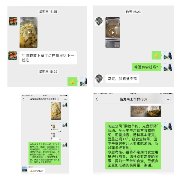 臨海南收費所不只是單單把宣傳標語掛在墻上,擺在桌上。更把節(jié)約舉措落實到具體行動中。為了不浪費食材,行政人員提前安排一周菜單,并統(tǒng)計用餐人數(shù),規(guī)劃食材數(shù)量,食堂工作人員按照人數(shù)采購當天食材控制成本,并將每餐燒好的菜拍成視頻上傳食堂交流群,以更好地關注食堂動態(tài),從源頭把控菜量與伙食的品質,每周還不定期抽查食堂,查看剩余量。