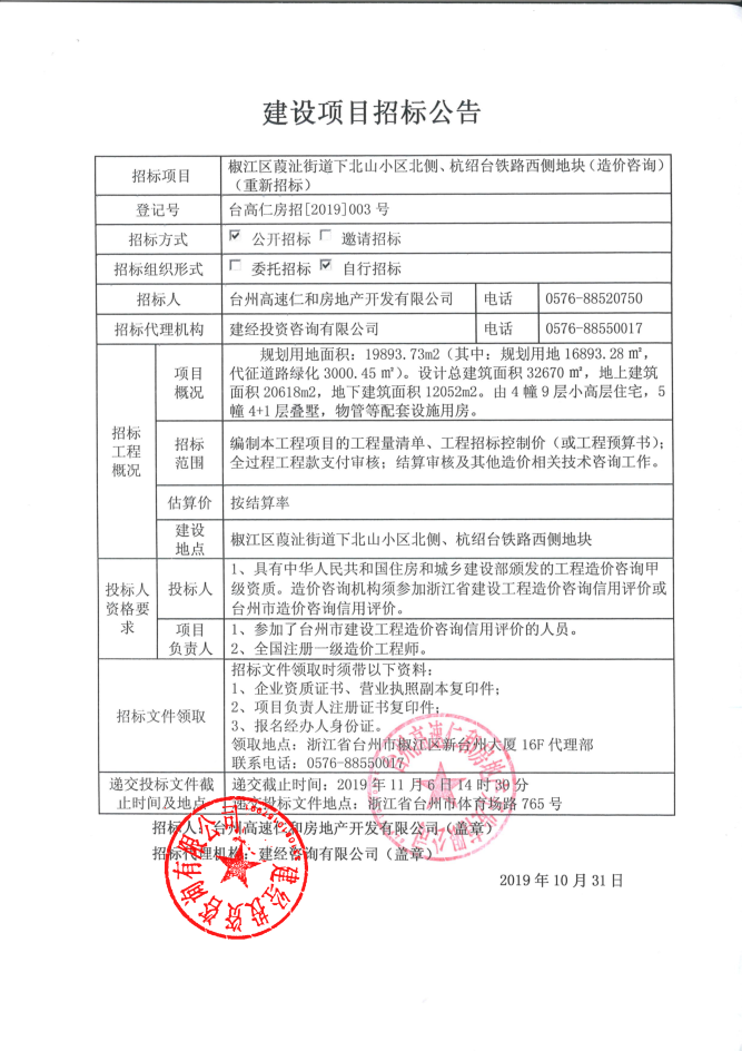 椒江區葭沚街道下北山小區北側、杭紹臺鐵路西側地塊(造價咨詢)招標