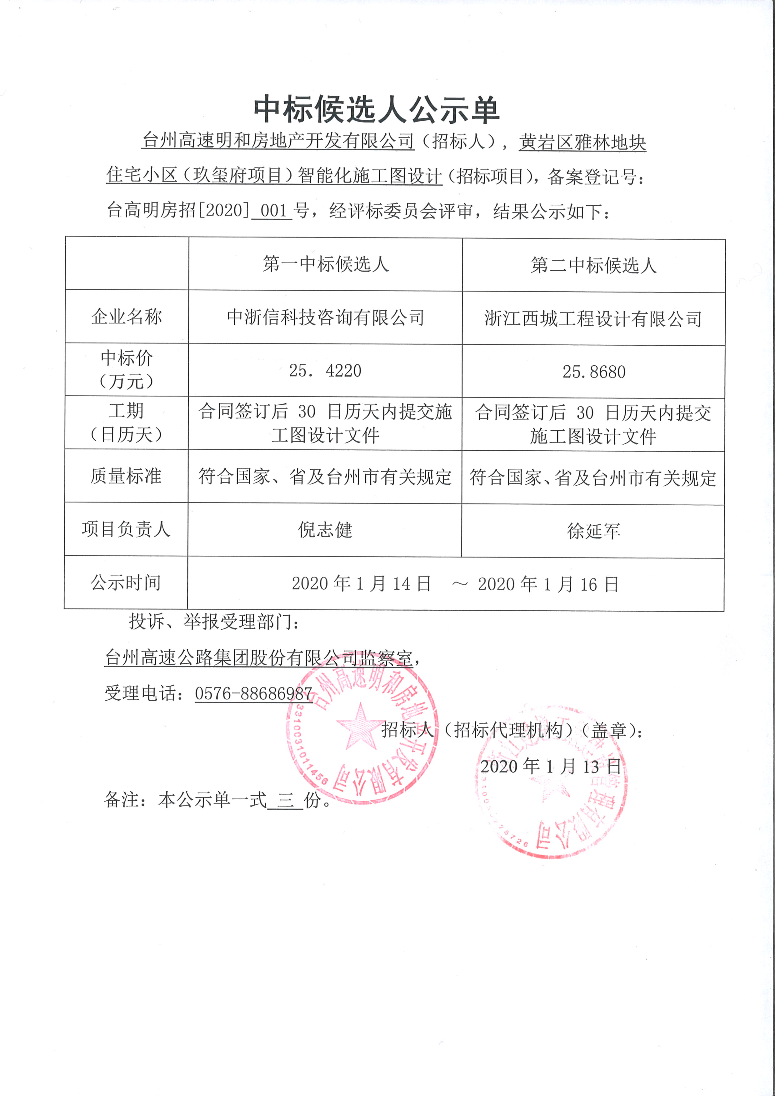 黃巖區(qū)雅林地塊住宅小區(qū)(玖璽府項目)智能化施工圖設計中標候選人公示單