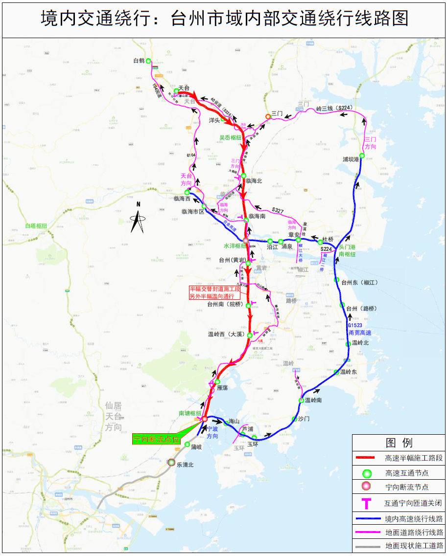 因G15沈海高速(甬臺(tái)溫)、G1522常臺(tái)高速(上三)臺(tái)州段路面大型專(zhuān)項(xiàng)施工需要,根據(jù)《中華人民共和國(guó)道路交通安全法》第三十九條之規(guī)定,對(duì)甬臺(tái)溫高速南塘樞紐至三門(mén)互通、上三高速吳岙樞紐至天臺(tái)互通實(shí)行單向斷流施工交通管制措施。